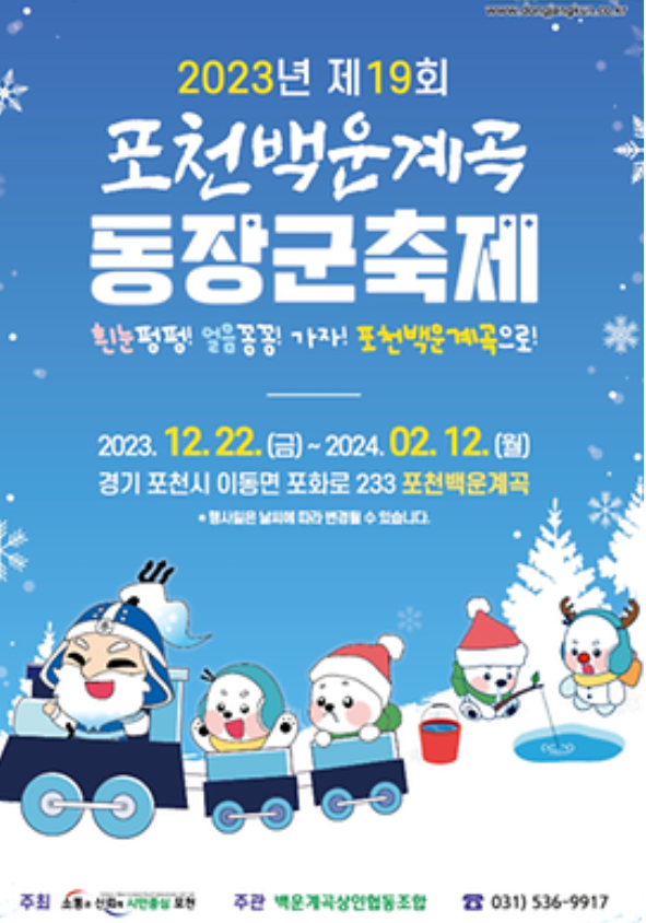 산과 계곡이 어우러져 경치가 아름다운 포천백운계곡에서 마을 주민이 주관한 제19회 포천백운계곡 동장군 축제가 열린다. "흰눈 펑펑! 얼음 꽁꽁! 가자! 포천 백운계곡!" 슬로건으로 축제를 개최한다.