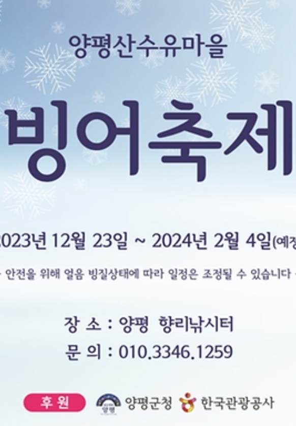 제6회 양평 산수유마을 빙어축제를 개최한다. 서울에서 1시간 거리에 위치하며 6만여평의 아름답고 광활한 저수지 위에서 축제가 펼쳐진다.