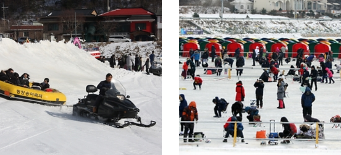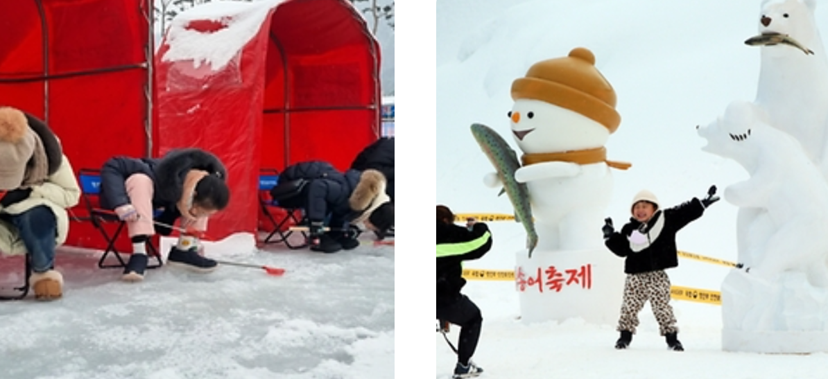 산천어 얼음낚시의 손맛은 물론 바로 회나 구이로 맛있게 먹을 수 있고 낚시 외에도 얼음썰매, 눈썰매, 봅슬레이 등의 다양한 겨울놀이가 펼쳐져 매년 100만명 이상이 방문하고 있다.