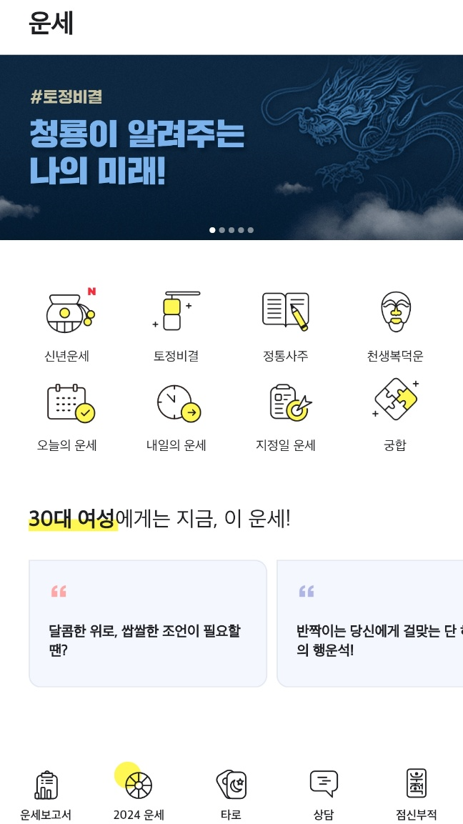 점신은 신년운세 뿐만 아니라 토정비결/정통사주/오늘의 운세/지정일 운세/궁합/타로 등 다양한 카테고리별로 볼 수 있다