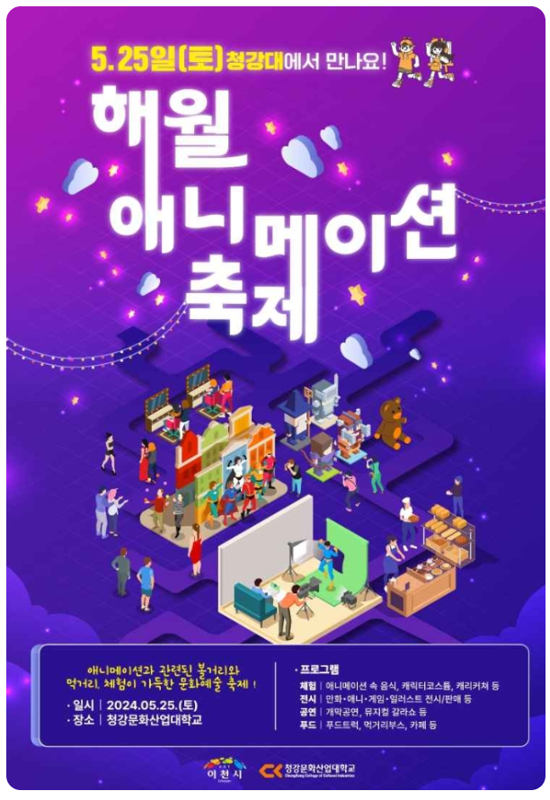 지역 주민과 학생이 함께하는 '해월 애니메이션축제'가 24년 5월 25일 (토) 청강대학교에서 처음 개최된다.