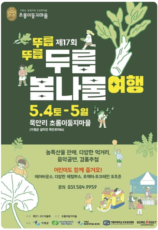 봄나물의 신선함과 푸른 자연 속에서 피어나는 활력을 느끼며, 두릅, 봄나물의 다채로운 맛과 체험을 할 수 있는 특별한 행사이다.