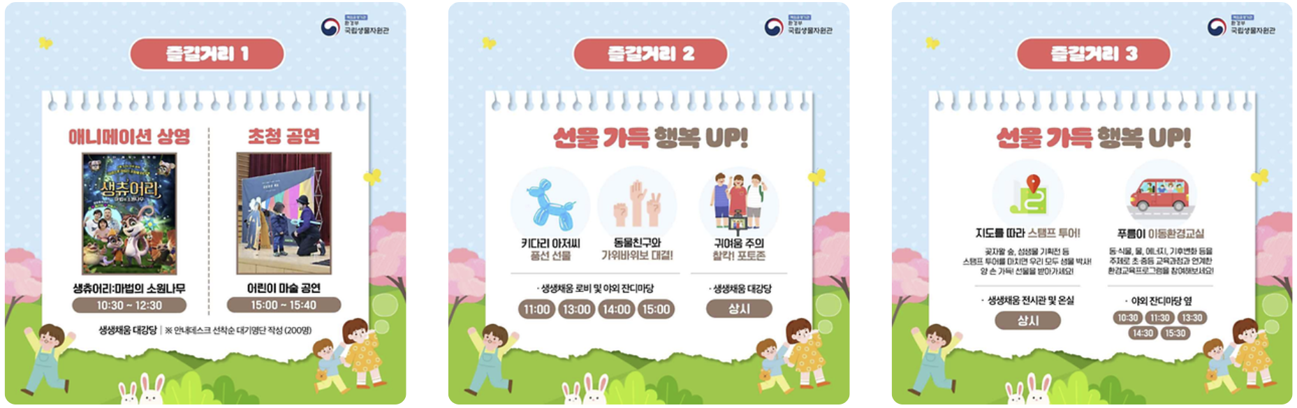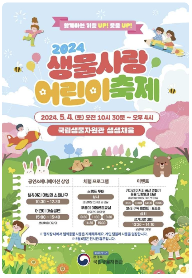 국립생물자원관 생생채움에서는 이번 어린이날을 맞아 <함께하는 기쁨 UP! 웃음 UP! 2024 생물사랑 어린이축제> 행사가 진행된다.