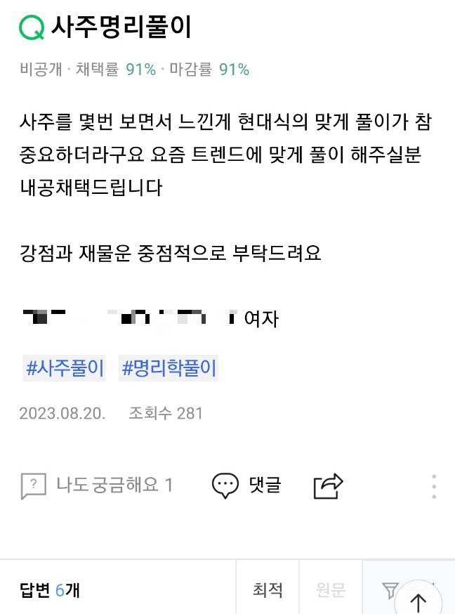 그래서 사주명리 전문가들의 다양한 해석을 듣고 싶었다 하지만 그러기에는 시간과 비용이 만만찮게 들어가니 생각해 낸 묘안, 바로 네이버 지식인 활용하기!