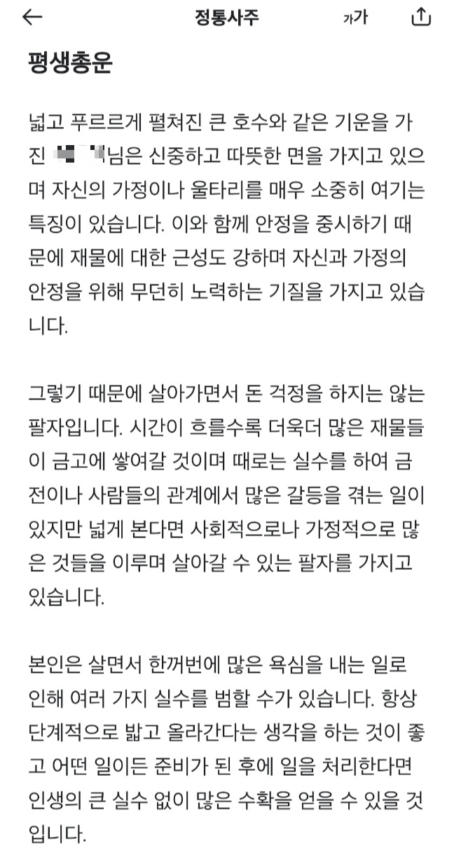 정통사주의 경우 평생총운과 대운분석, 나의 전성기, 주의가 필요한 시기, 조언, 능력, 재물, 애정, 건강등이 상세하게 나와 있어 아주 좋다