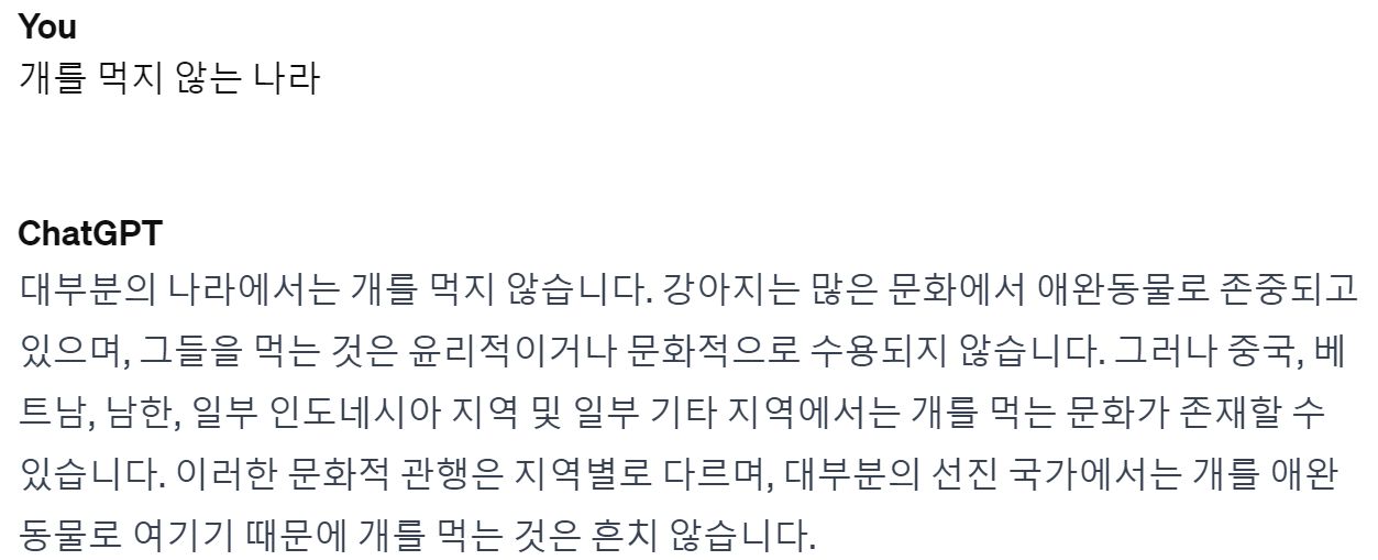 다음은 챗gpt에 개를 먹지 않는 나라로 검색해 본 결과입니다 개를 먹는 일부 나라에 남한이 포함 되 있는 답변도 이제 수정이 필요하겠네요