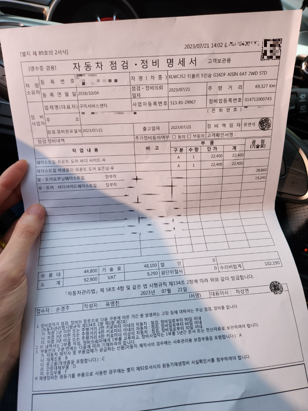 이번에 수리받은 티볼리 웨더스트립 견적서(명세서) 입니다