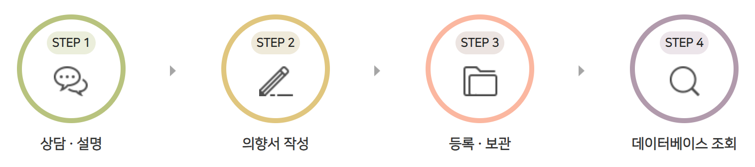 등록기관을 통해 작성 및 등록된 사전연명의료의향서는 연명의료 정보처리시스템의 데이터베이스에 보관되어야 비로소 법적 효력을 인정 받을 수 있습니다