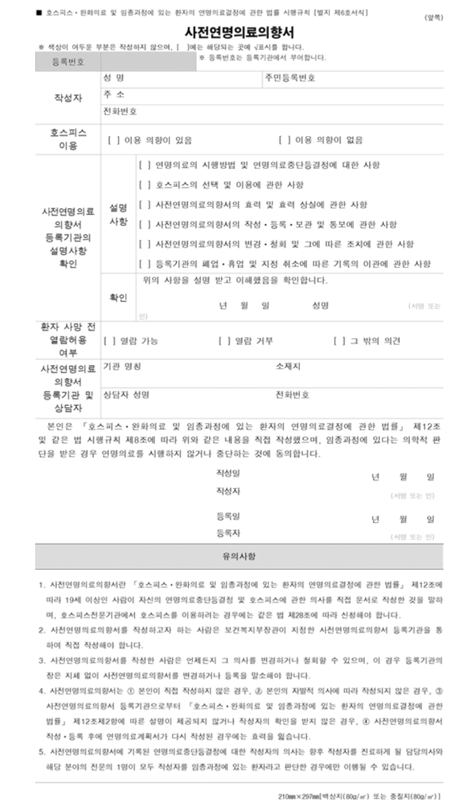 *본 서식은 예시용으로, 의향서 등록을 원하는 분은 가까운 등록기관에 방문하여 상담사의 설명을 듣고 작성하셔야 합니다