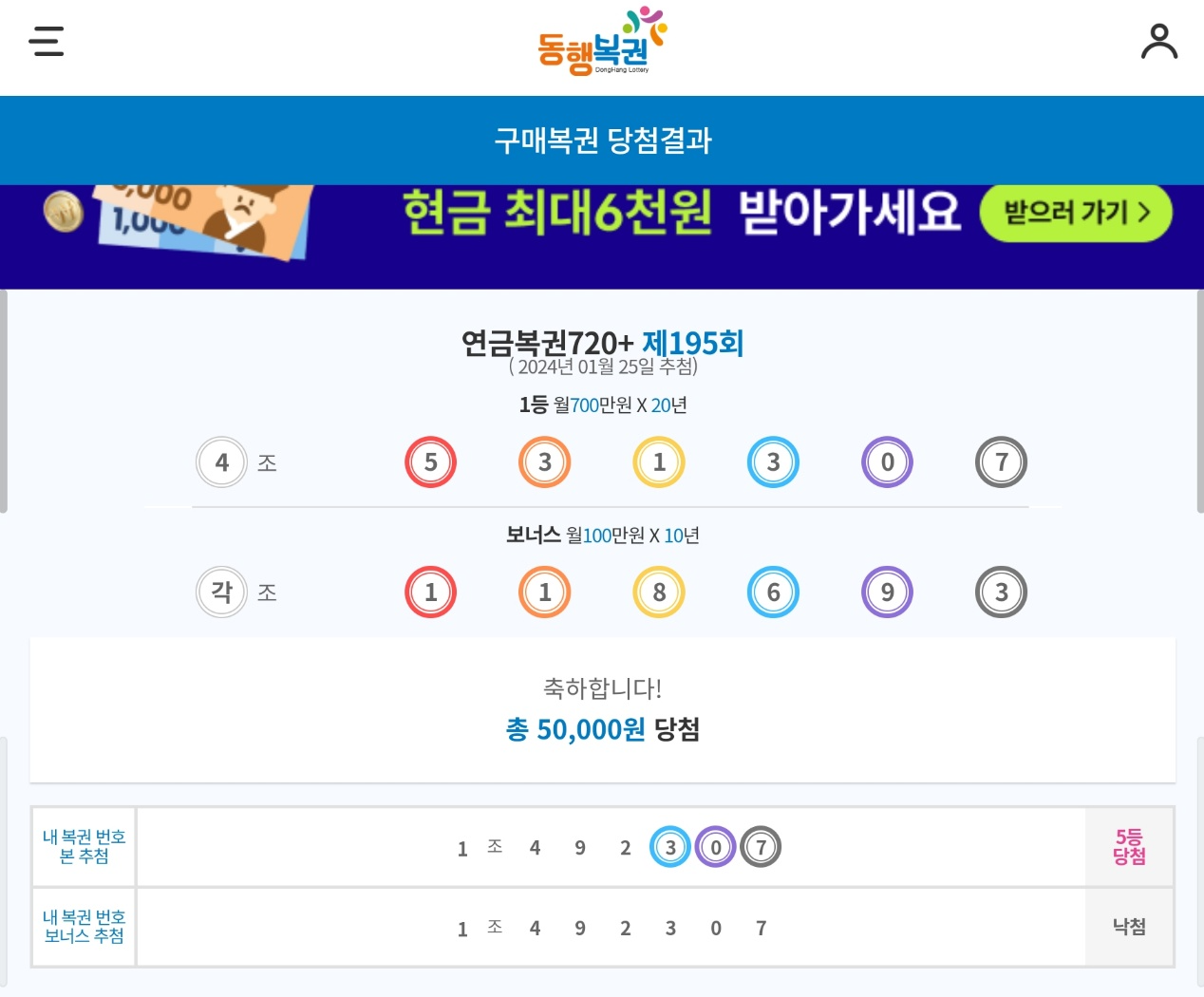당첨 확인을 위해 카메라 앱을 켜고 큐알코드를 읽히니 5등 50,000원 당첨이라는 이미지가 떠서 깜짝 놀랐습니다