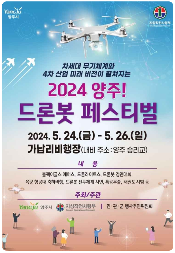 양주시가 지상작전사령부와 함께 오는 5월 24일부터 26일까지 가납리비행장(내비 검색 시 “양주 승리교”)에서 3일간 ‘2024 양주! 드론봇 페스티벌’을 개최한다.