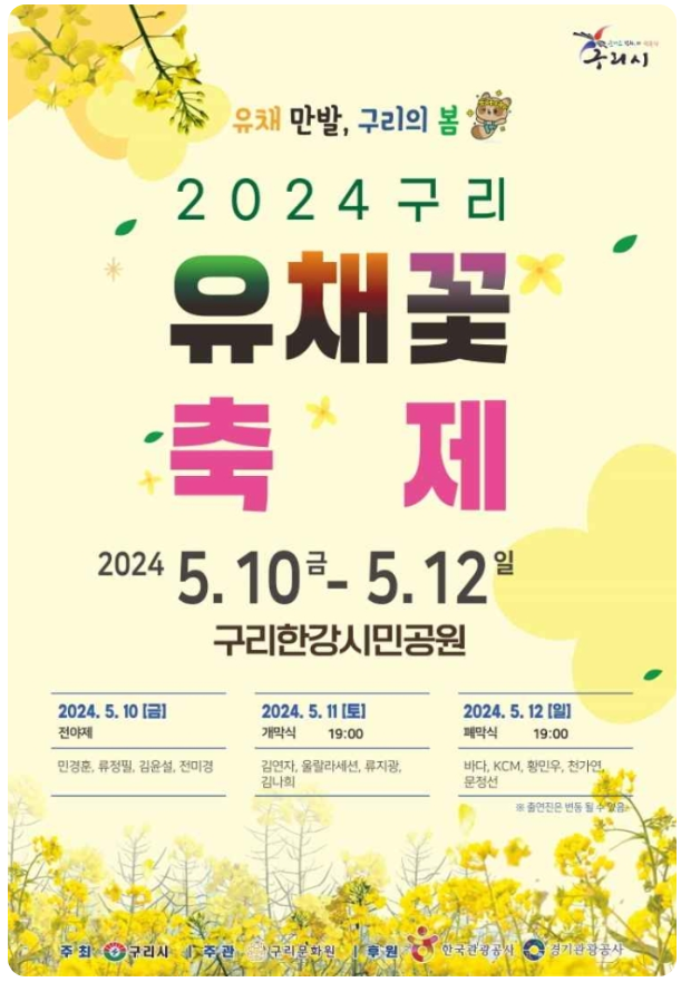 구리시를 대표하는 봄축제로 한강 최대 꽃단지인 구리한강시민공원에 봄꽃이 만발하여 대자연의 장관을 만끽할 수 있다.