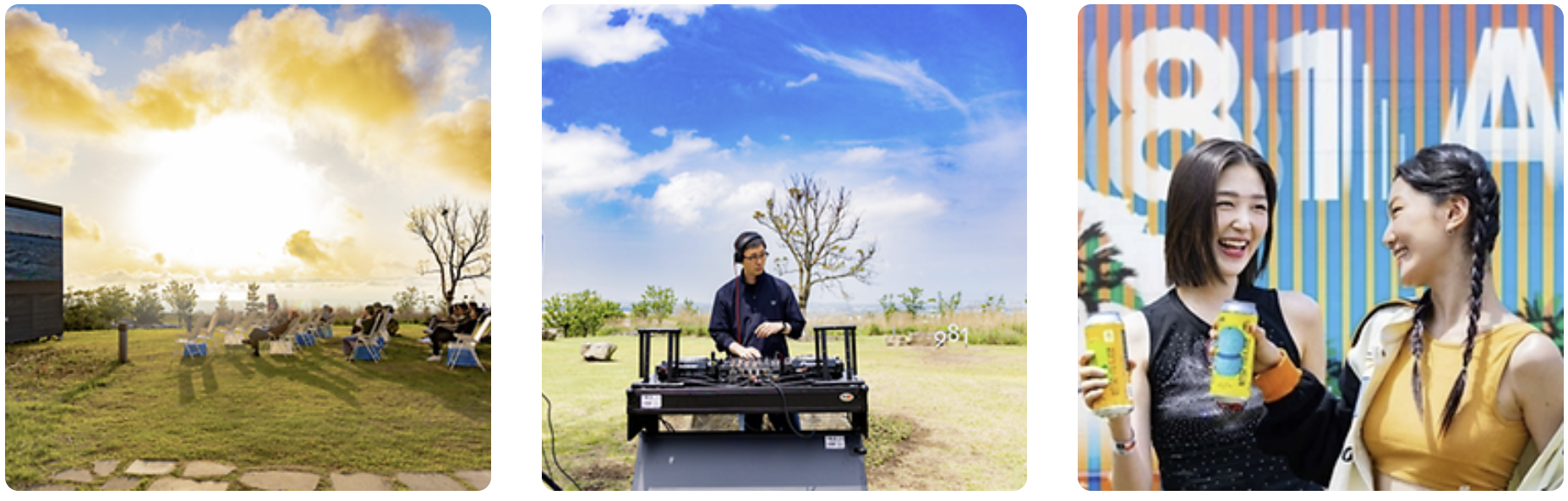DJ DUDU, DJ dguru, DJ 홍하연 이들의 라이브를 여기서 만나다니! 이름만 들어도 설레는 이들의 무대가 제주 애월 바다를 배경으로 펼쳐진다. 피켓팅없이 입장 가능한 것도 놀라운데, 내 눈앞에 이거 지금 제주도 바다 실화? 돗자리 하나 펼쳐놓고 따스한 제주 햇살을 이불삼아 넓은 잔디에 누워 오늘 하루 이렇게 힐링~